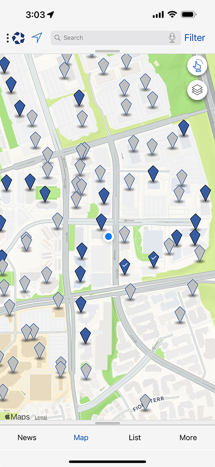 Navigation confuse : Les boutons « Map » et « List » ne sont que des modes de vue, pas des destinations. | Nouvelle Barre de Navigation : Introduction de points d’entrée dédiés (Search, News, Directory, Menu). | Clarté : Réduction de la charge cognitive et accès direct aux piliers de l’app. |